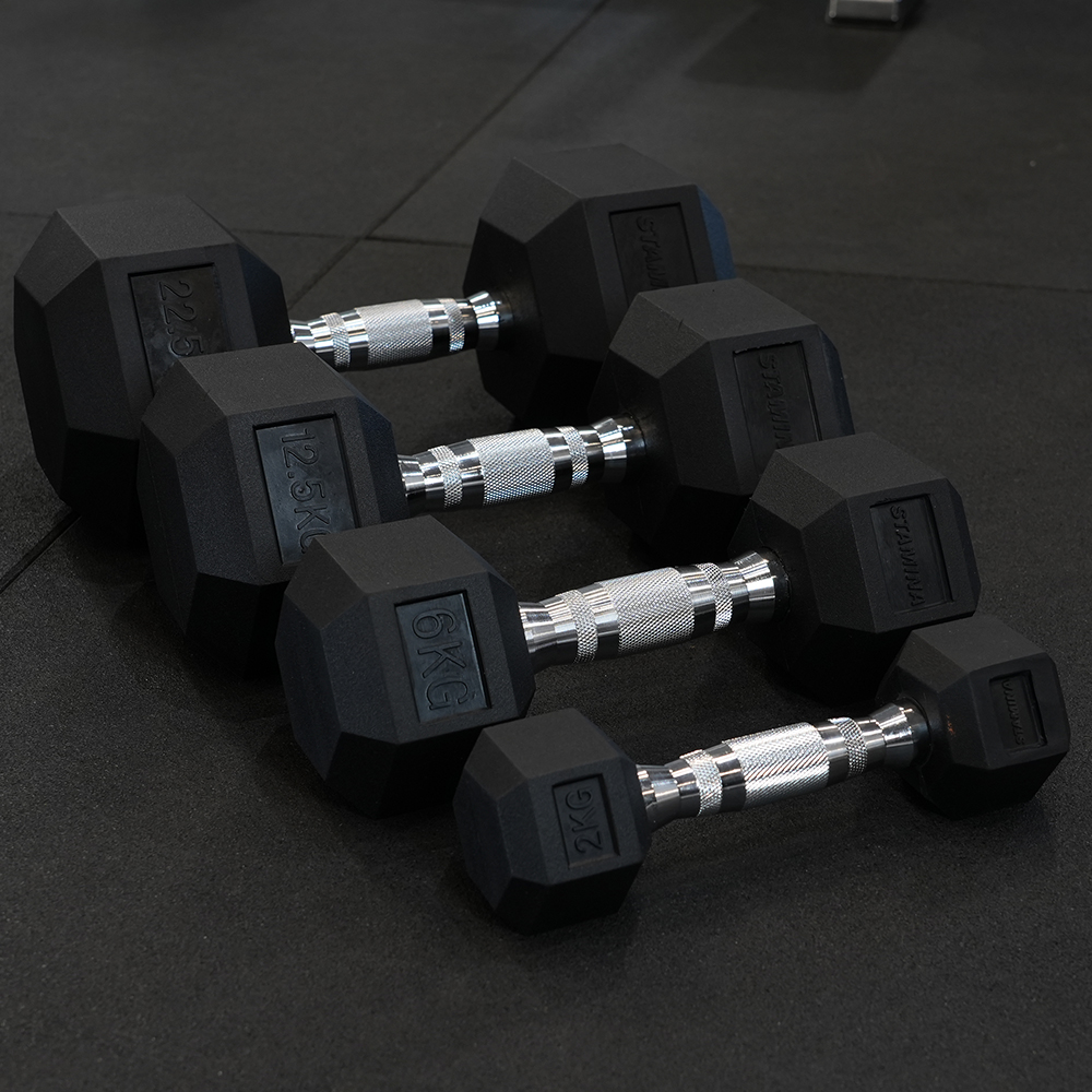 Hantle sześciokątne HEX w zakresie od 1 do 35 kg. Gumowane głowice chronią podłogę i redukują hałas, a radełkowany uchwyt zapewnia pewny chwyt. Idealne do treningu siłowego, funkcjonalnego i rehabilitacji.